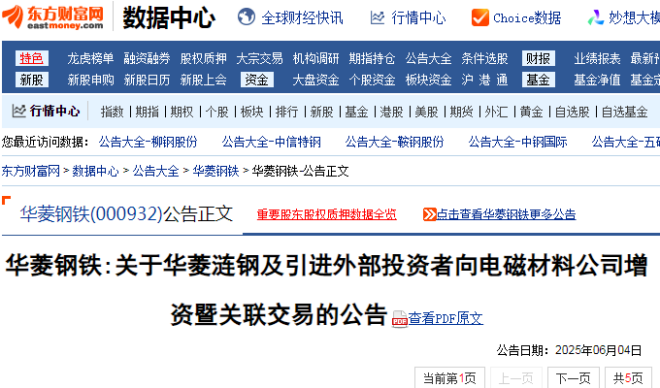 6月4日,華菱鋼鐵發布了關於華菱漣鋼及引進外部投資者向電磁材料公司增資暨關聯交易的公告(以下簡稱“公告”)。