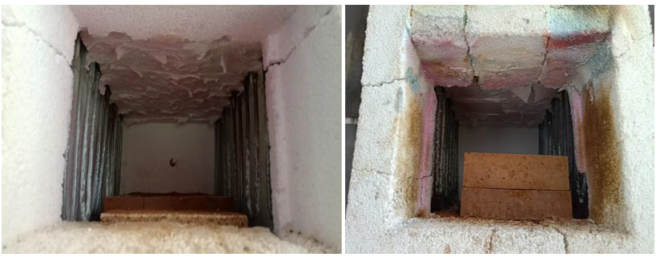 使用納米保溫輕質磚和傳統空心球磚砌築的高溫加熱爐內襯,在經過3個月使用後,空心球磚發生開裂,破損嚴重,聯合榮大研發的新型納米保溫輕質磚狀態良好,未發生破損開裂(如圖2)。