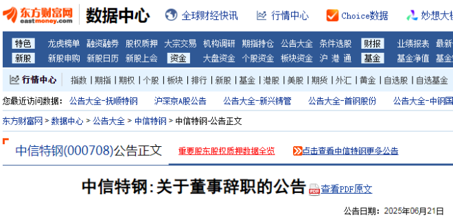 6月21日,中信特鋼發布了關於董事辭職的公告。