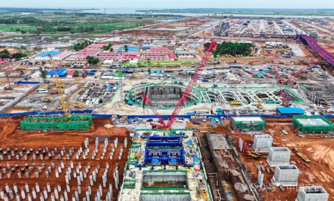 5月28日,記者在港區的製高點,也是北部區塊港口工程的關鍵性項目——已封頂的翻車機房房頂上看到,整個港區一派繁忙景象,吊機林立、施工車輛川流不息,但夜間下雨讓道路顯得有些泥濘。西芒杜港口控股公司、西芒杜港口項目公司物資設備部部長陳強告訴記者:“進jin入ru雨yu季ji後hou,我wo們men這zhe裏li會hui一yi天tian到dao晚wan不bu停ting地di下xia雨yu,室shi外wai作zuo業ye基ji本ben都dou停ting了le,隻zhi能neng進jin行xing室shi內nei作zuo業ye。因yin此ci,各ge參can建jian單dan位wei都dou加jia派pai人ren手shou,爭zheng取qu在zai雨yu季ji來lai臨lin前qian,完wan成cheng必bi要yao的de室shi外wai工gong程cheng施shi工gong。目mu前qian,360平方米的港區內,集聚了共7000人左右的中外施工人員。很多項目需要協同推進,通過現場精密安排和協調指揮,12項工程正同步進行作業。”