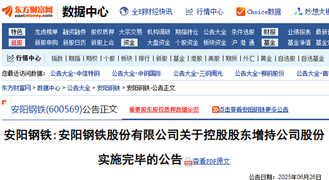 6月25日,安陽鋼鐵(600569)發布了安陽鋼鐵股份有限公司關於控股股東增持公司股份實施完畢的公告(以下簡稱“公告”)。