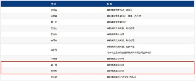 據首鋼集團官網最新顯示,薑楠、金洪利已任首鋼集團副總經理。