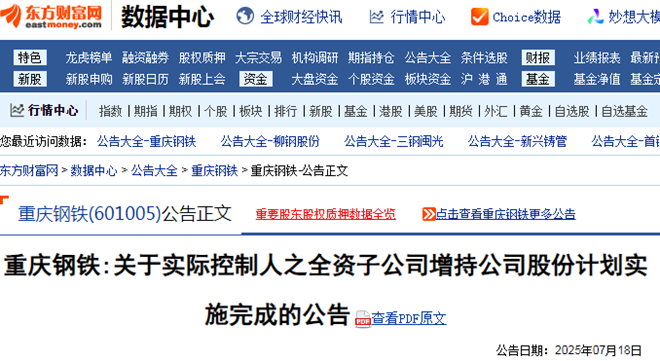 7月18日,重慶鋼鐵發布了關於實際控製人之全資子公司增持公司股份計劃實施完成的公告(以下簡稱“公告”)。
