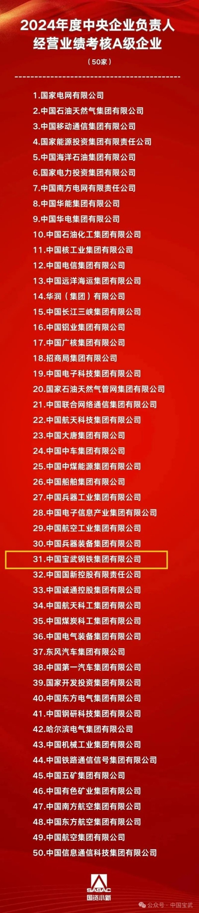 7月18日,國務院國資委發布了2024年度和2022—2024年任期中央企業負責人經營業績考核結果,寶武在兩項考核中均獲評A級。這是寶武連續第九年獲評年度中央企業負責人經營業績考核A級,今年排名第31位,較上年上升1位。