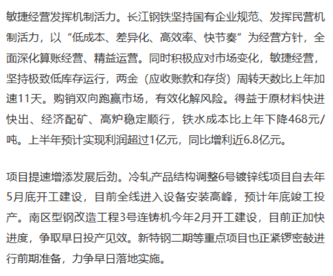 今年以來,在中國寶武黨委的堅強領導下,在安徽省委、省政府、省國資委和馬鞍山市委、市政府的大力支持下,馬鋼上下堅定不移深化改革,全力以赴變革突破,推動經營績效明顯改善。上半年,馬鋼集團預計利潤總額12.06億元,與上年同期相比增利10.11億元。
