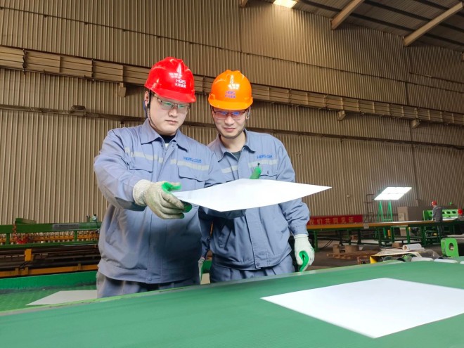 圖為河鋼集團大河金屬質檢人員正在檢查家電板產線產品質量。