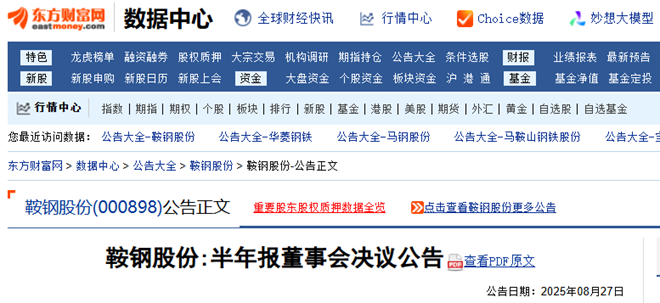 8月27日,鞍鋼股份發布《鞍鋼股份:半年報董事會決議公告》(以下簡稱《公告》)。