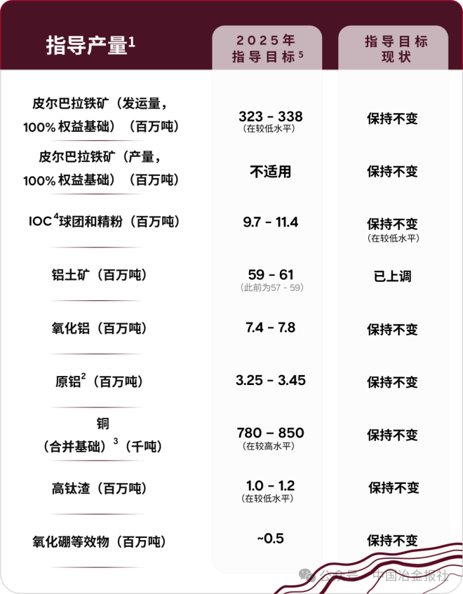 除鋁土礦的2025年產量指導目標上調外,所有其他產品的產量指導目標保持不變。
