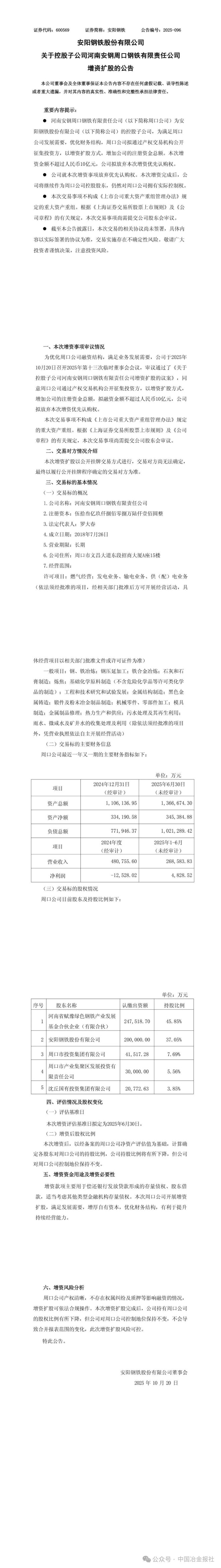 10月20日,安陽鋼鐵股份有限公司(以下簡稱公司)發布公告,控股子公司河南安鋼周口鋼鐵有限責任公司(以下簡稱周口公司)為滿足周口公司發展需要,優化財務結構,擬通過產權交易機構公開征集投資方,以增資擴股方式增加注冊資金總額,增資金額不超過10億元。公司擬放棄本次增資優先認購權。增資完成後,公司將繼續作為周口公司控股股東,對周口公司擁有實際控製權。