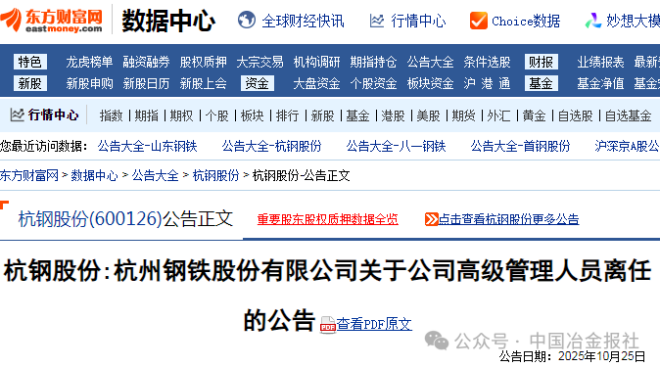 10月25日,杭鋼股份發布了關於公司高級管理人員離任的公告。
