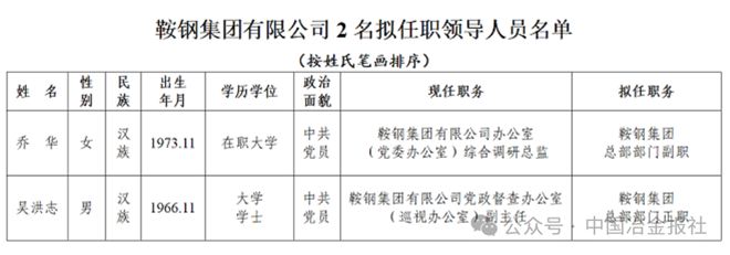 鞍鋼集團擬任職2位領導人員