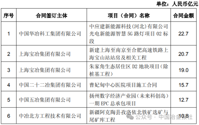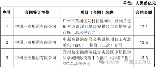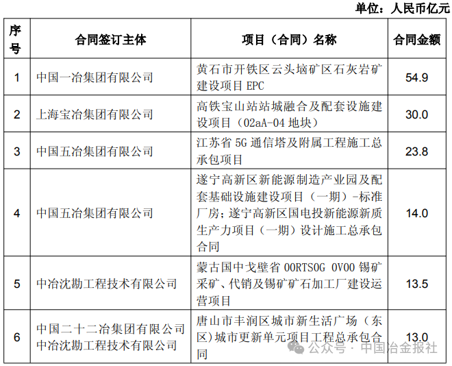 截至4月8日,中國中冶部分新簽單筆合同額在人民幣10億元以上的重大工程承包項目如下: