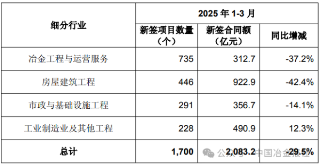 1-3月份中國中冶新簽工程承包項目主要經營數據如下: