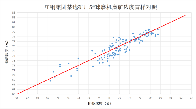 目前,產品已成功落地江銅集團某選礦廠、首鋼集團某選礦廠等行業標杆企業。在江銅選礦廠的長期運行數據跟蹤中,通過采集117組盲樣進行誤差分析顯示:樣本覆蓋濃度範圍的化驗區間為69.25%~79.8%,預測區間為68.77%~79.54%,盲樣總體標準偏差達1.51%,在線預測值與化驗值相關性良好(R^2=0.83)。江銅集團某冶煉廠、晉南礦業某選礦廠等合作項目也在穩步推進,未來將為更多企業的磨礦工藝升級提供技術支撐。