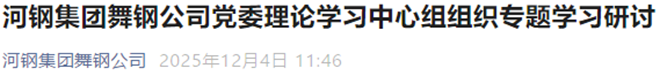 12月4日,河鋼集團舞鋼公司官微發布《河鋼集團舞鋼公司黨委理論學習中心組組織專題學習研討》一文。