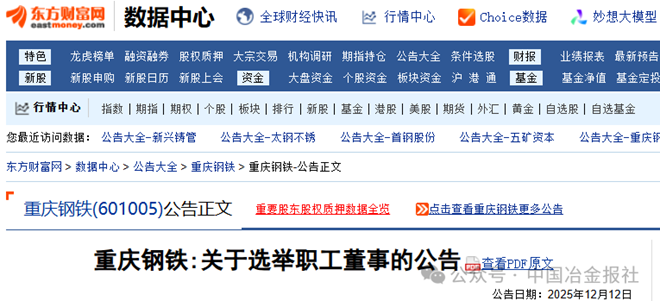 12月12日,重慶鋼鐵發布《關於選舉職工董事的公告》(以下簡稱《公告》)。