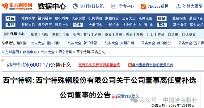 12月10日,西寧特鋼發布《西寧特殊鋼股份有限公司關於公司董事離任暨補選公司董事的公告》(以下簡稱《公告》)。