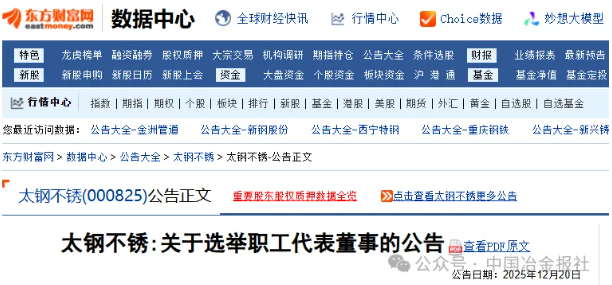 12月20日,太鋼不鏽發布了《關於選舉職工代表董事的公告》(以下簡稱《公告》)。