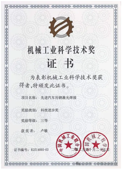 洪雙教授領銜完成的學術專著《先進汽車用鋼激光焊接》,憑(ping)借(jie)在(zai)汽(qi)車(che)用(yong)鋼(gang)激(ji)光(guang)焊(han)接(jie)領(ling)域(yu)的(de)係(xi)統(tong)性(xing)創(chuang)新(xin)與(yu)產(chan)業(ye)化(hua)貢(gong)獻(xian),近(jin)日(ri)榮(rong)獲(huo)機(ji)械(xie)工(gong)業(ye)科(ke)技(ji)進(jin)步(bu)獎(jiang)三(san)等(deng)獎(jiang),成(cheng)為(wei)行(xing)業(ye)技(ji)術(shu)創(chuang)新(xin)與(yu)知(zhi)識(shi)傳(chuan)播(bo)深(shen)度(du)融(rong)合(he)的(de)優(you)秀(xiu)範(fan)例(li)。