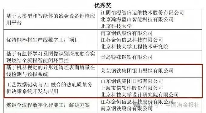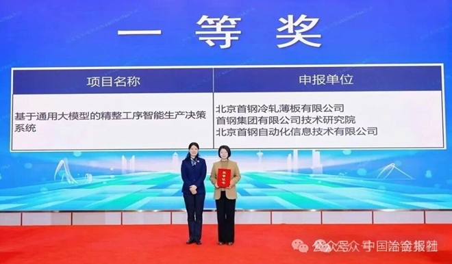近日,由中國鋼鐵工業協會主辦的“第五屆智能製造創新大賽原材料(鋼鐵)行業賽道決賽”傳來捷報:首鋼冷軋、首鋼技術研究院和首自信公司聯合打造的《基於通用大模型的精整工序智能生產決策係統》項目,從25個入圍決賽的優秀項目中脫穎而出,成功摘得一等獎桂冠。首鋼京唐和首鋼技術研究院《基於電磁感應加熱的精軋溫度智能控製係統》、首鋼股份《鋼鐵企業智慧碳管理平台的創新與應用》2個項目獲得三等獎。