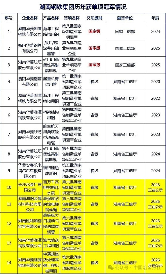 1月5日,湖南省工信廳發布的《關於第六批湖南省製造業單項冠軍企業名單和複核通過第一批、第二批、第三批湖南省製造業單項冠軍企業名單的公示》,湖南鋼鐵集團旗下湘鋼、漣鋼、長沙水泵廠、湘鋼金屬材料、勝利湘鋼鋼管等5家企業憑借細分領域的技術優勢與市場領導力成功入選第六批省製造業單項冠軍,湖南鋼鐵在高端製造領域的榮譽矩陣再添新績。