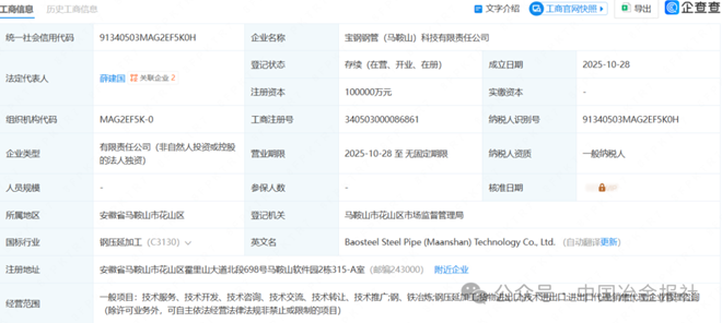 2025年10月28日,寶鋼鋼管(馬鞍山)科技有限責任公司成立,法定代表人為薛建國,注冊資本10億人民幣。經營範圍包括鋼、鐵冶煉;鋼壓延加工;貨物進出口等。該公司由寶鋼管業科技有限公司全資持股,後者為寶鋼股份全資子公司。