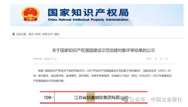 近日,國家知識產權局正式發布《2025—2027年國家知識產權強國建設示範創建對象評審結果的公示》,江蘇省镔鑫鋼鐵集團有限公司(以下簡稱“镔鋼集團”)憑借在知識產權領域的深厚積澱與卓越創新實力,成功入選“國家知識產權示範企業創建對象”名單。這一殊榮不僅是國家層麵對公司知識產權創造、運用、保護、管理全鏈條工作的權威認可,更是公司踐行創新驅動發展戰略、賦能鋼鐵行業轉型升級的重要裏程碑。