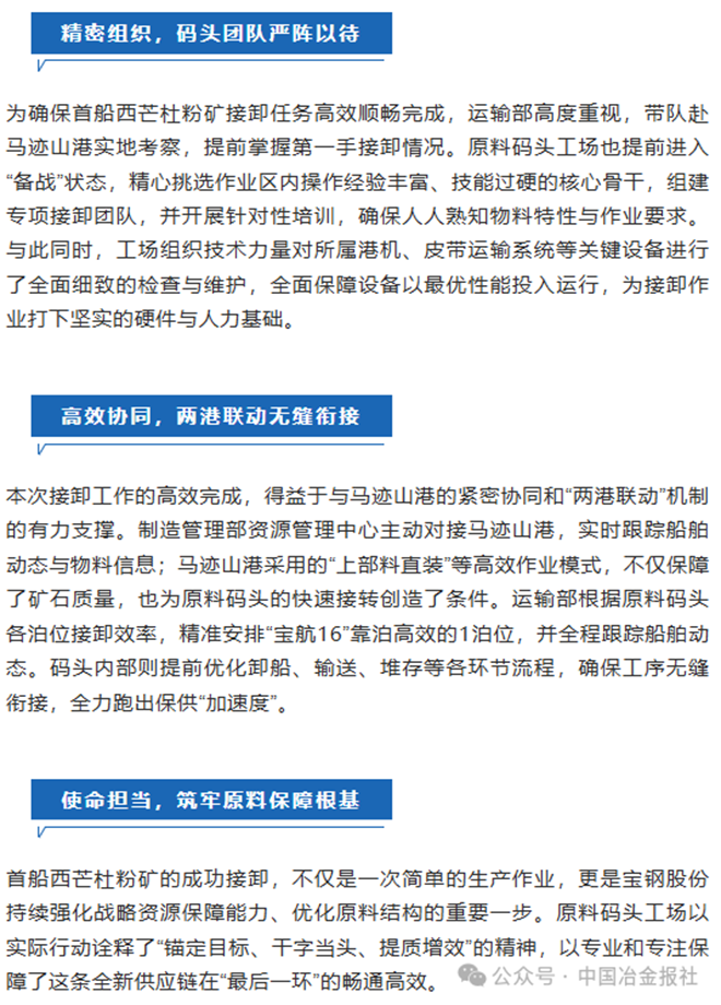 展望未來,寶鋼股份將深化與寶武資源等兄弟單位的協同聯動機製,共同構建更具韌性、安全、高效的原料保障體係,為生產經營穩定順行和全麵建設世界一流企業提供堅實支撐。