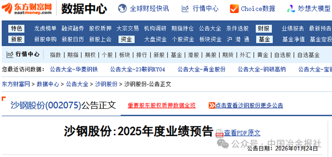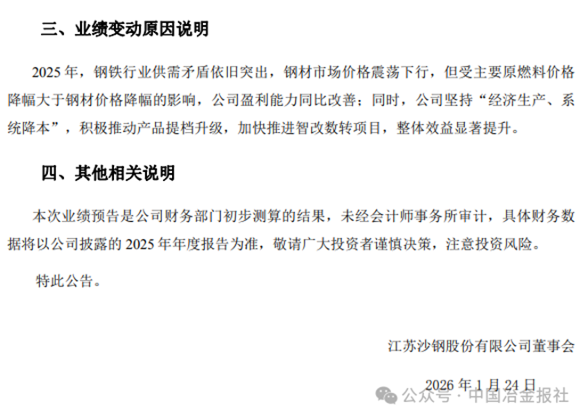 1月24日,沙鋼股份發布《2025年度業績預告》(以下簡稱《預告》)。