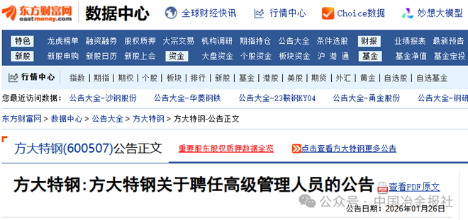 1月26日,方大特鋼發布《方大特鋼關於聘任高級管理人員的公告》(以下簡稱《公告》)。