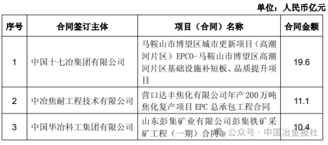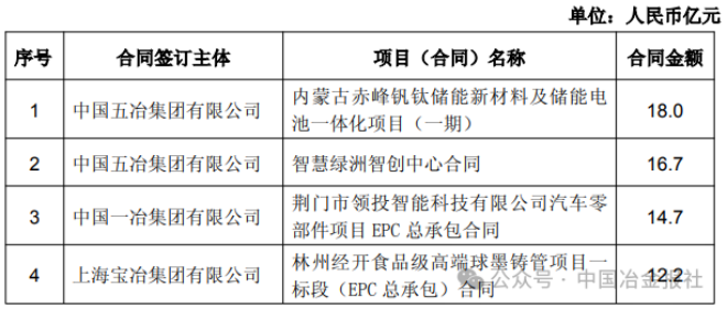 2026年1月,中國五冶集團有限公司簽訂內蒙古赤峰釩鈦儲能新材料及儲能電池一體化項目(一期),合同額18.0億元,上海寶冶集團有限公司簽訂林州經開食品級高端球墨鑄管項目一標段(EPC 總承包)合同,合同額12.2億元。