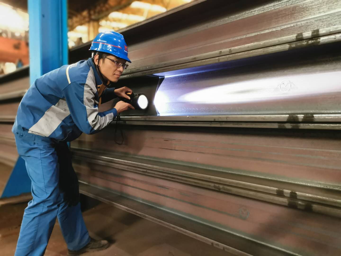 圖為質檢人員認真檢查剛下線的H型鋼表麵質量。