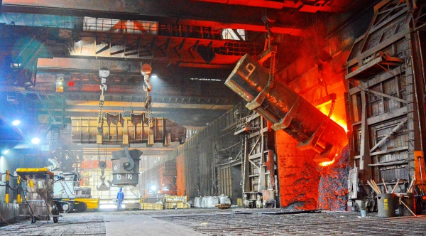 圖為元月7日下午馬鋼長材事業部煉鋼現場,行車工正操作行車將廢鋼配料兌入煉鋼爐。