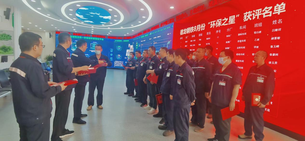 麵對當前環保形勢,德龍鋼鐵作為環保標杆企業勇於擔當,緊緊圍繞丁立國董事長提出的“低頭彎腰做環保,挺胸抬頭說環保”理念,以“星星之火可以燎原”之勢,立足全國首家在產鋼鐵企業國家4A級旅遊景區和國家環保A級企業,通過樹立典型、發揮基層“環保衛士”模範帶頭作用,持續開展“環保之星”評選活動,並每月組織舉行“環保之星”頒獎儀式,提振士氣、統一思想,全麵夯實基層環保治理堡壘。