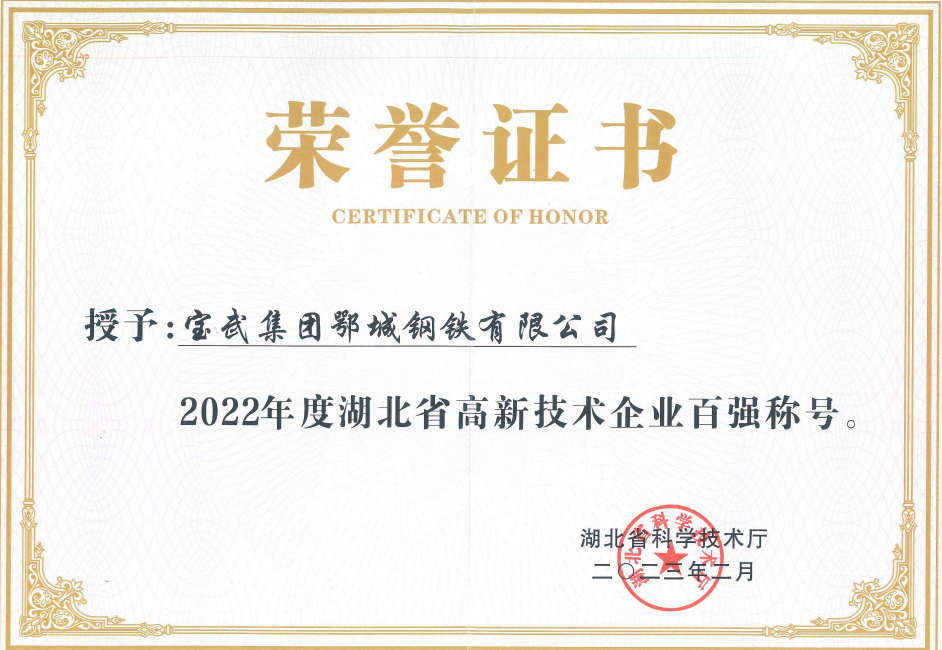 近日,湖北省發布了《2022年度湖北省高新技術企業百強榜單》(以下簡稱百強榜單),鄂城鋼鐵入選百強榜單,位列第18名。這是鄂州市所在區域高新技術企業第一次獲此殊榮。