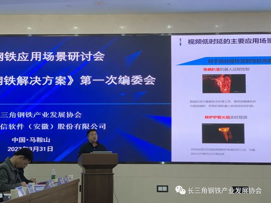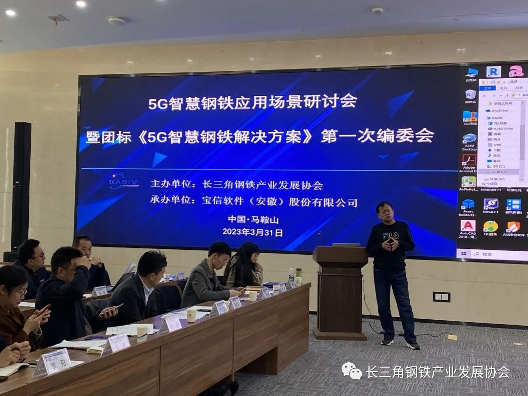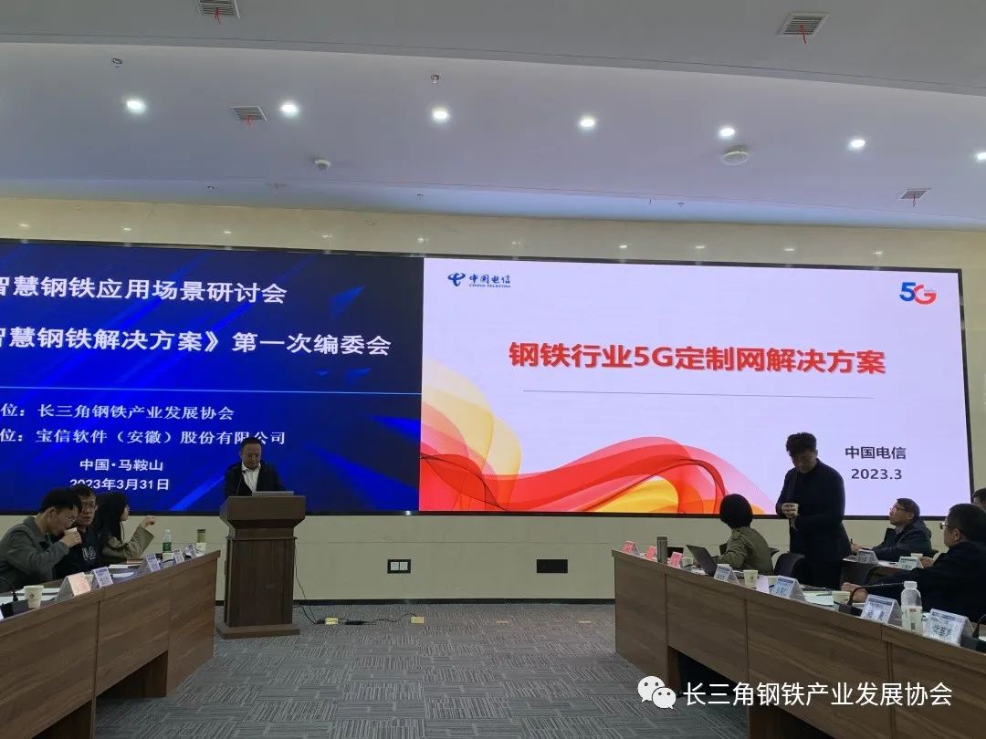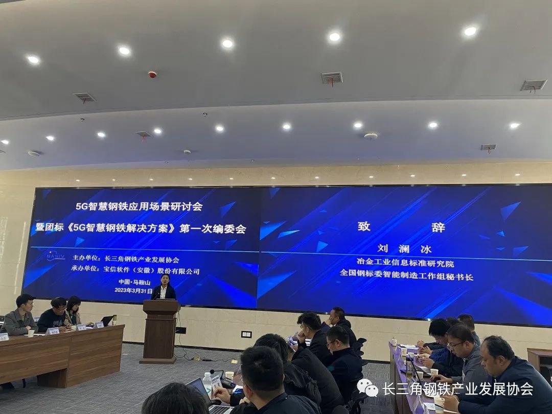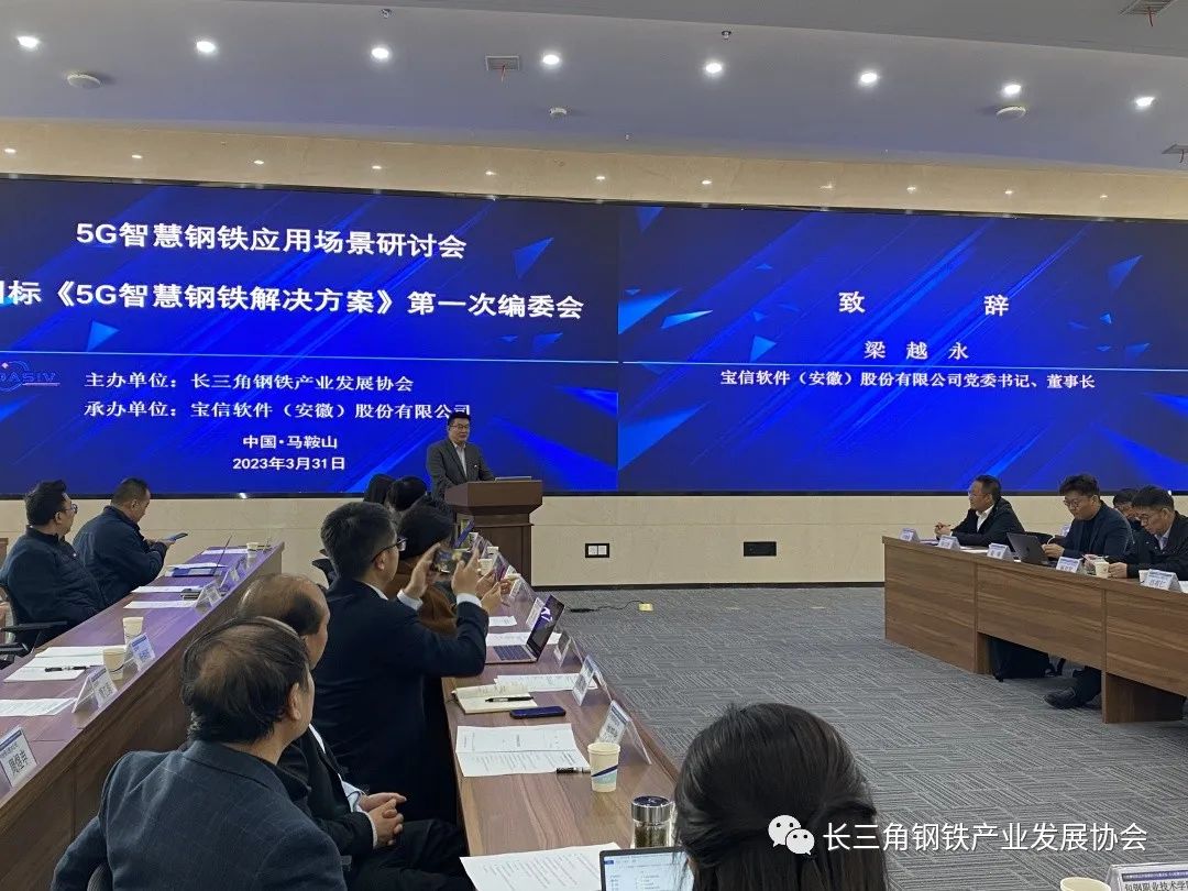 2023年3月31日下午,長三角鋼鐵產業發展協會主辦的"5G智慧鋼鐵應用場景研討會暨團標《5G智慧鋼鐵解決方案》第一次編委會"在寶信軟件(安徽)股份有限公司暨馬鞍山智能裝備及大數據產業園召開。
