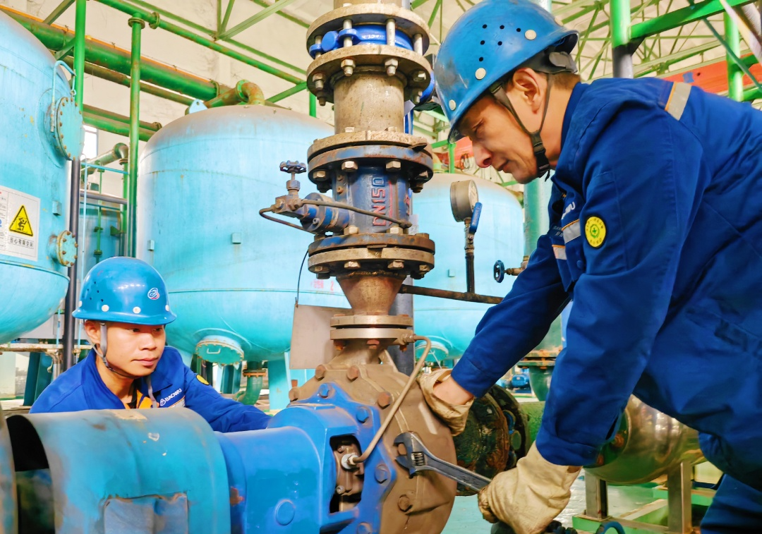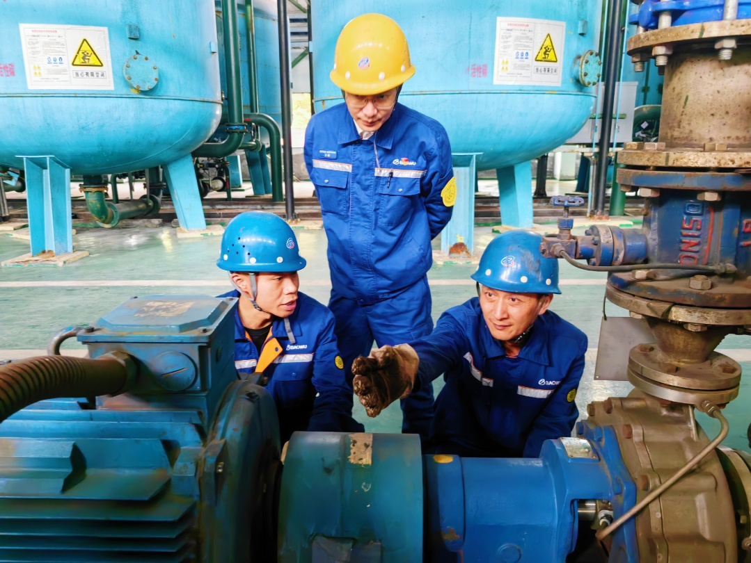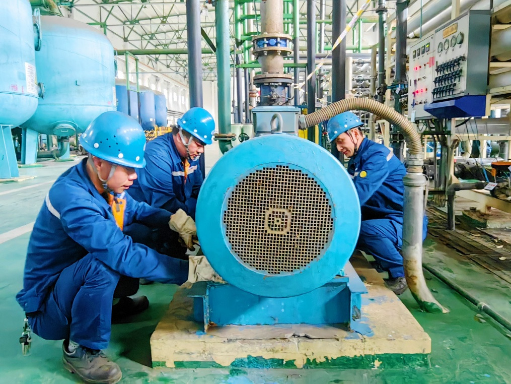 4月12日,在能源環保部水處理作業區現場,檢修班員工順利完成除鹽水站一級高壓泵軸承更換工作,標誌著能源環保部啟動協力變革後第一個檢修回歸業務項目首戰告捷。