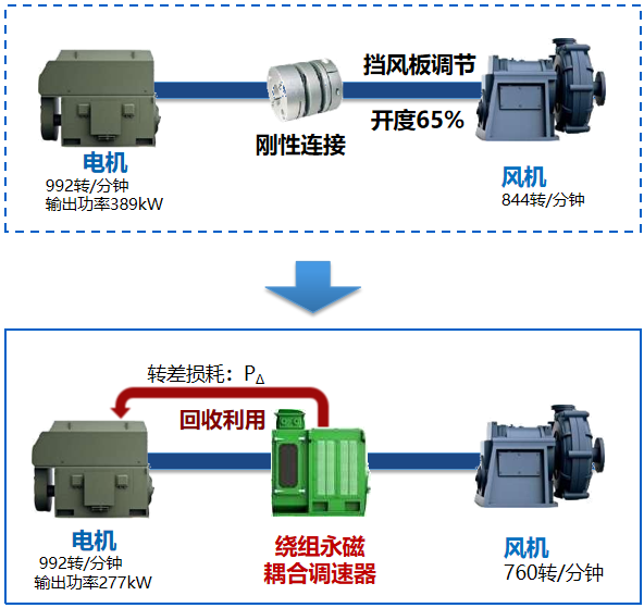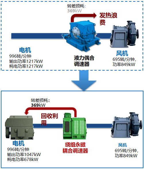“江陰興澄特鋼二煉鐵1#、2#兩台1000kW主排風機改造項目”:使用繞組永磁調速器替換原有調速型液力偶合器改造,節電率為29%。