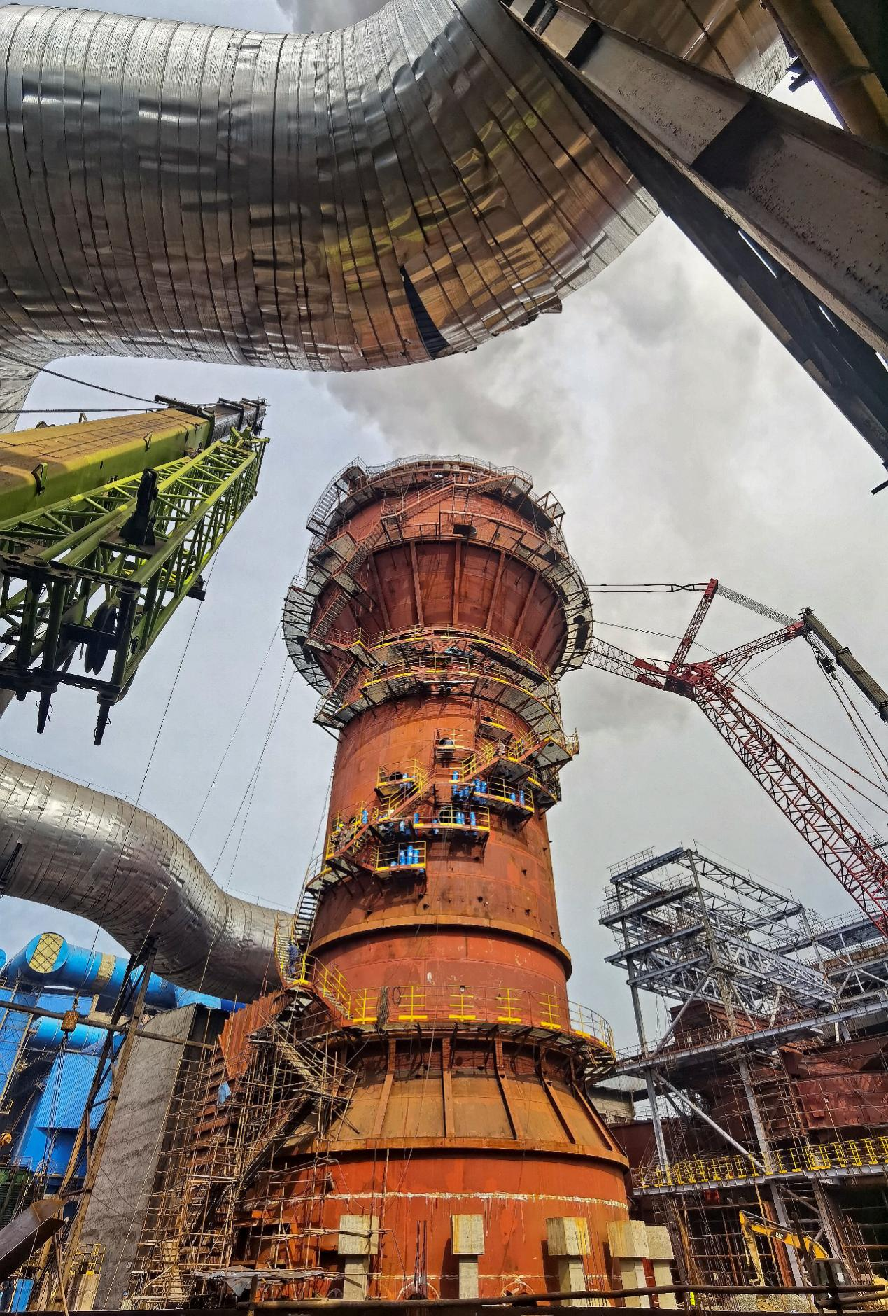 中國寶武新鋼集團煉鐵事業部6#燒結機煙氣超低排放改造項目正在緊張施工之中,該項目包括機頭除塵“電改袋”項目和新建脫硫脫硝超低排放改造兩個項目,計劃今年9月投運。機頭除塵采用布袋除塵技術,投運後可實現粉塵≤10mg/Nm3。脫硫脫硝采用“石灰石、石膏濕法脫硫+濕電除塵+SCR脫硝”工藝,投運後,二氧化硫排放濃度≤35mg/Nm3,氮氧化物排放濃度≤50mg/Nm3。目前,脫硫脫硝係統已完成脫硫塔主體結構,正在進行GGH、SCR支架安裝和脫硫塔防腐工作。圖為脫硫塔主體施工現場。(萬新東 甘誌鴻)