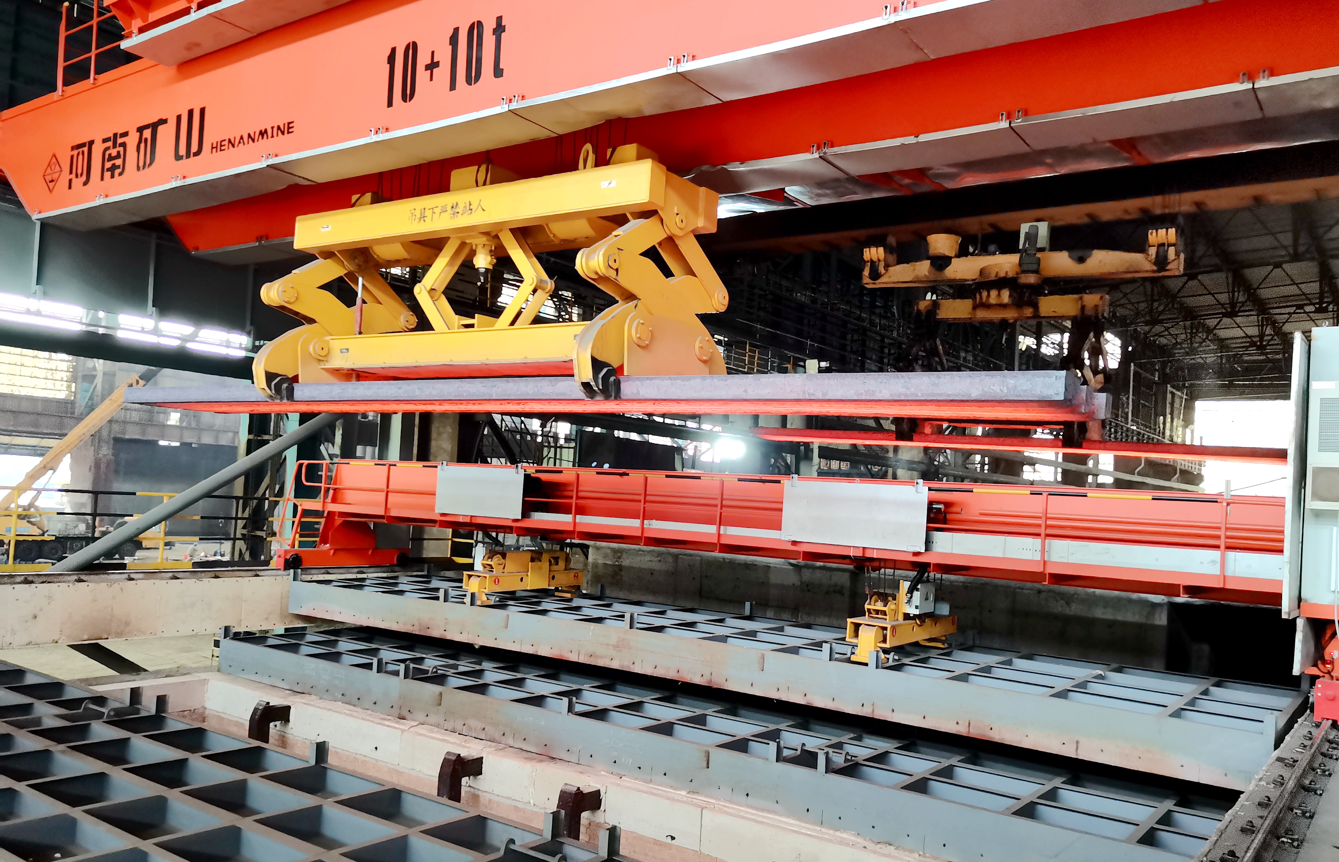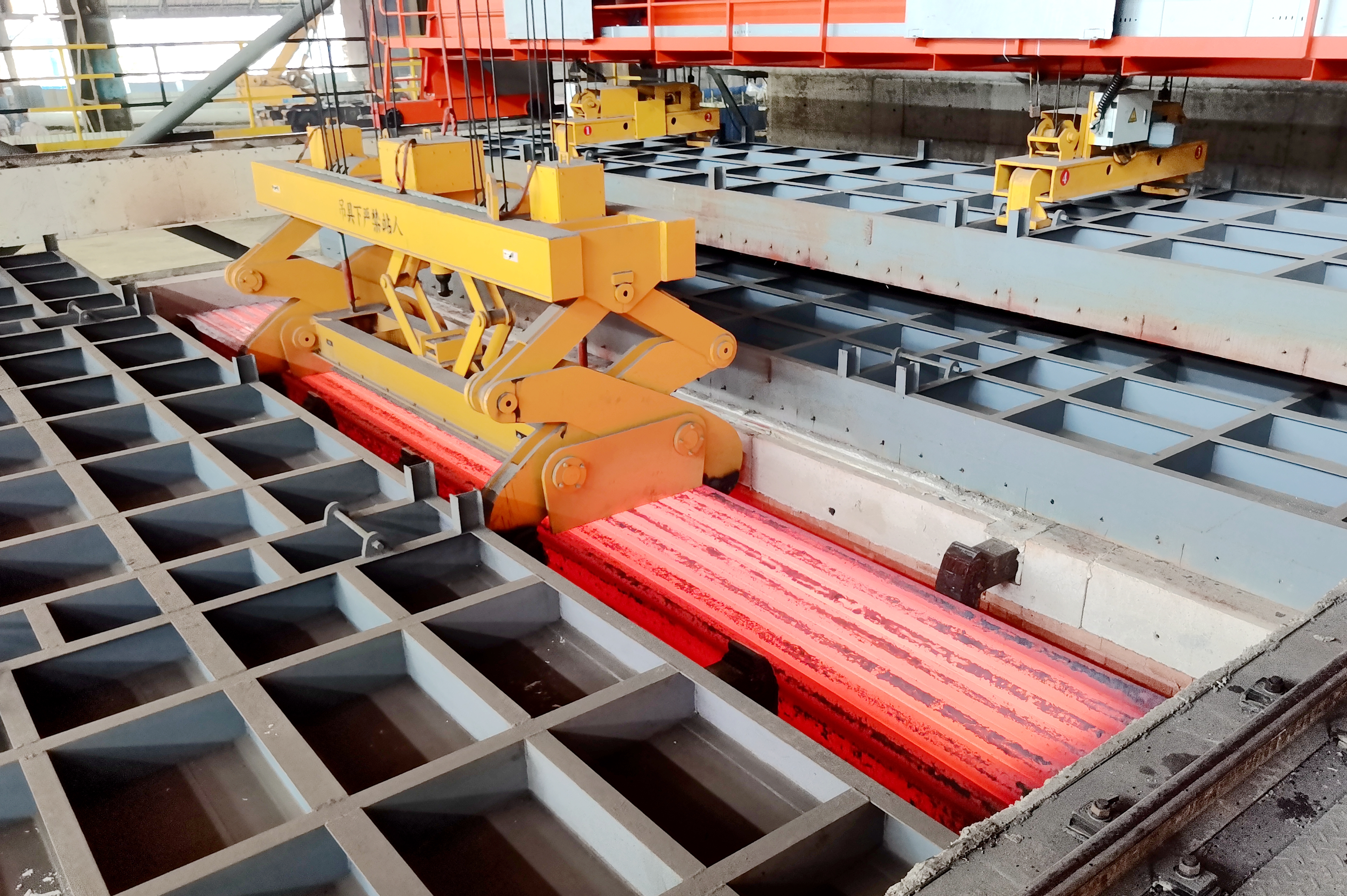 為提升生產效率,促進節能降耗,踐行綠色化、高效化、智能化、高端化的發展理念,特軋廠棒一線新增保溫坑5個,單個保溫坑容量350t,共可存儲1400t鋼坯。保溫坑和上料台架上方設置取鋼機、揭蓋機,實現鋼坯自動進出保溫坑。當連鑄坯由保溫車從3號連鑄機冷床處裝車運輸至棒一保溫坑,經取鋼機(ji)成(cheng)組(zu)吊(diao)運(yun)至(zhi)保(bao)溫(wen)坑(keng)內(nei)或(huo)上(shang)料(liao)台(tai)架(jia)上(shang),經(jing)入(ru)爐(lu)輥(gun)道(dao)送(song)入(ru)加(jia)熱(re)爐(lu)加(jia)熱(re),從(cong)而(er)減(jian)少(shao)下(xia)線(xian)鋼(gang)坯(pi)的(de)熱(re)能(neng)損(sun)失(shi),降(jiang)低(di)加(jia)熱(re)爐(lu)燃(ran)料(liao)消(xiao)耗(hao),加(jia)快(kuai)生(sheng)產(chan)節(jie)奏(zou),提(ti)高(gao)生(sheng)產(chan)效(xiao)率(lv)。