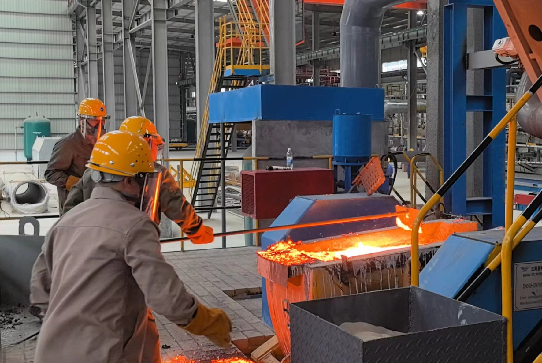 14時13分,爐前工白雪峰開始操作中頻爐傾倒鐵水,鐵水如同一道紅色瀑布湧入球化包中。14時34分,隨著拉管機將“第一管”順利產出,現場全體員工歡呼雀躍,球墨鑄管項目試生產成功啟動,取得“開門紅”。