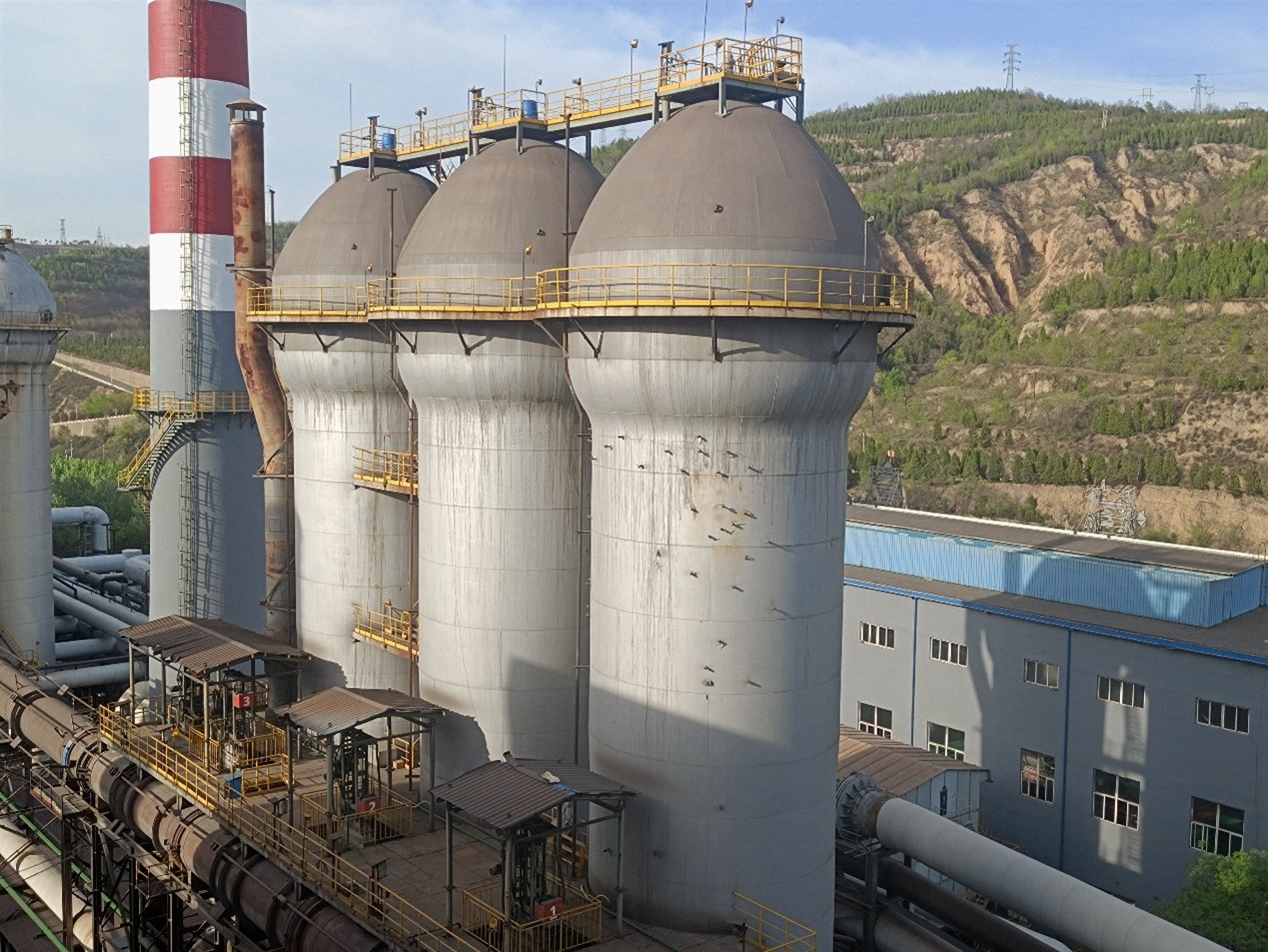 圖為山西省某鋼鐵公司2號1280m³高爐配置的3座仿霍戈文內燃式熱風爐即將采用爐殼利舊在線改造為豫興懸鏈線頂燃式熱風爐項目啟動儀式現場1