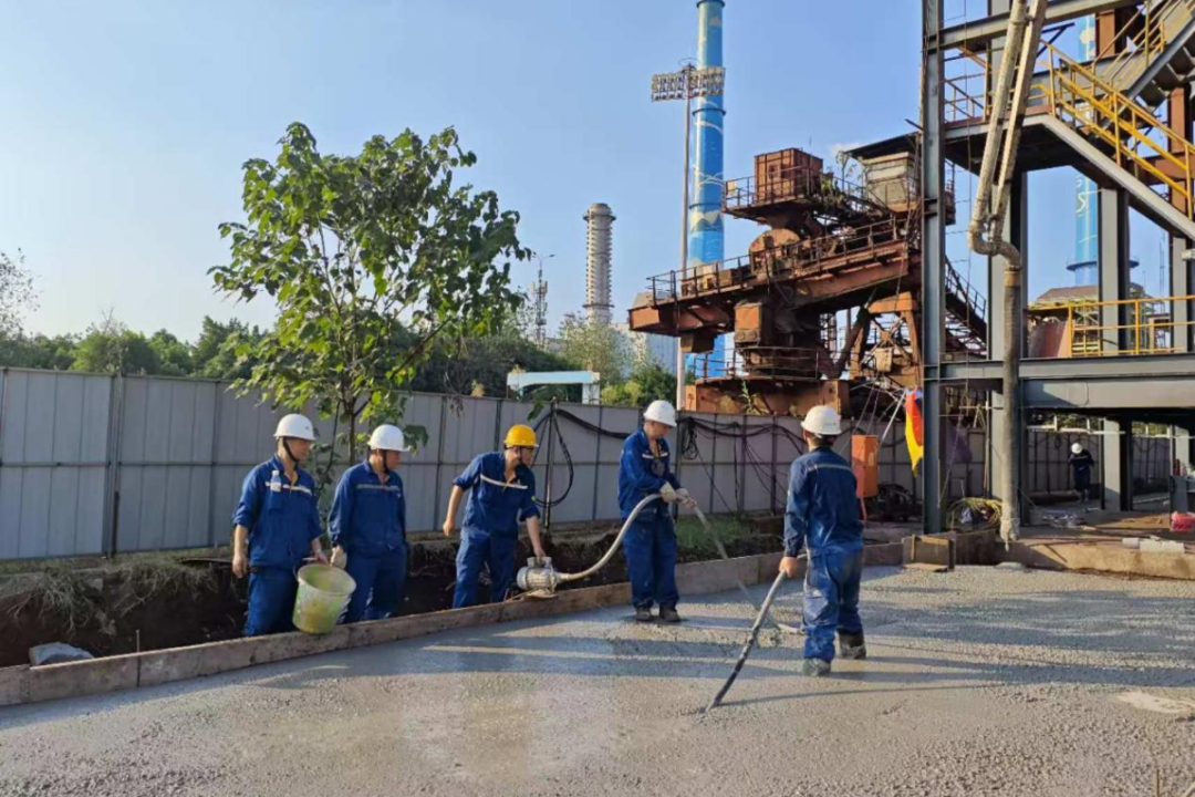 土建組負責現場土建基礎施工。重慶高溫讓施工區域白天地表溫度接近60℃,猶如走在熱鍋上。他們勇敢直麵挑戰,拉線劃線,精準定點位、定標高,一絲不苟。綁鋼筋時全神貫注,確保牢固程度,澆水泥基礎時小心翼翼,如雕琢藝術品,完工後認真保養,確保工程耐久性。目前,土建組已自主實施300平方皮帶機基礎澆築及地麵硬化。