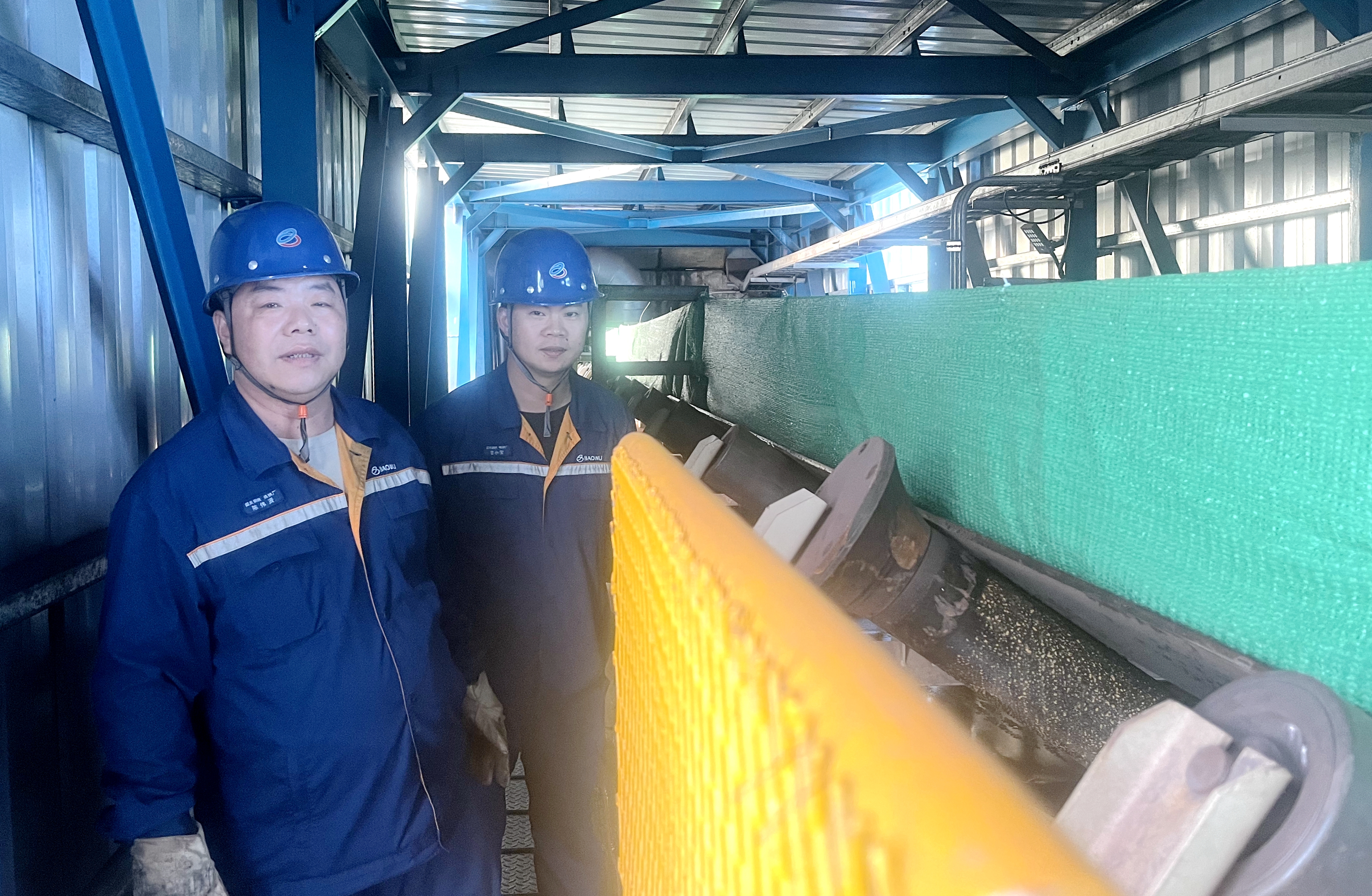為wei了le解jie決jue這zhe個ge難nan題ti,原yuan料liao生sheng產chan區qu域yu供gong料liao班ban班ban長chang甘gan小xiao寶bao深shen入ru現xian場chang調tiao研yan,最zui終zhong提ti出chu了le治zhi理li方fang法fa。本ben著zhe節jie約yue的de原yuan則ze,他ta利li用yong手shou頭tou上shang有you的de廢fei舊jiu材cai料liao,在zai皮pi帶dai機ji兩liang邊bian的de桁heng架jia上shang,每mei十shi米mi焊han接jie固gu定ding一yi組zu1米高“7”字型立柱,同時立柱上從頭到尾固定一根8mm的鋼絲繩,然後把平時用來蓋礦料的廢舊抑塵網掛在鋼絲繩上,與輸送帶形成一個封閉式的擋簾,從而有效避免輸送過程中球團礦滾落到通廊和人行走道上。此項自主改善活動,通過利用廢舊材料製作遮擋簾,有效結合現場實際,給長期漏料、清料區域拉上了“窗簾”,現場改善效果顯著,大大減少了清理人工費用並確保員工行走安全。