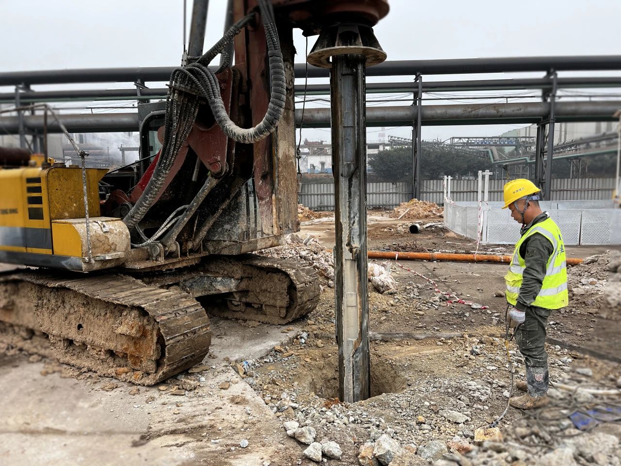 3月4日,在新建1000kw礦熱爐中試線項目現場,十餘米高的打樁機巍然矗立,伴隨著液壓錘的撞擊聲,混凝土裹挾碎石傾瀉而下,一派熱火朝天的景象。