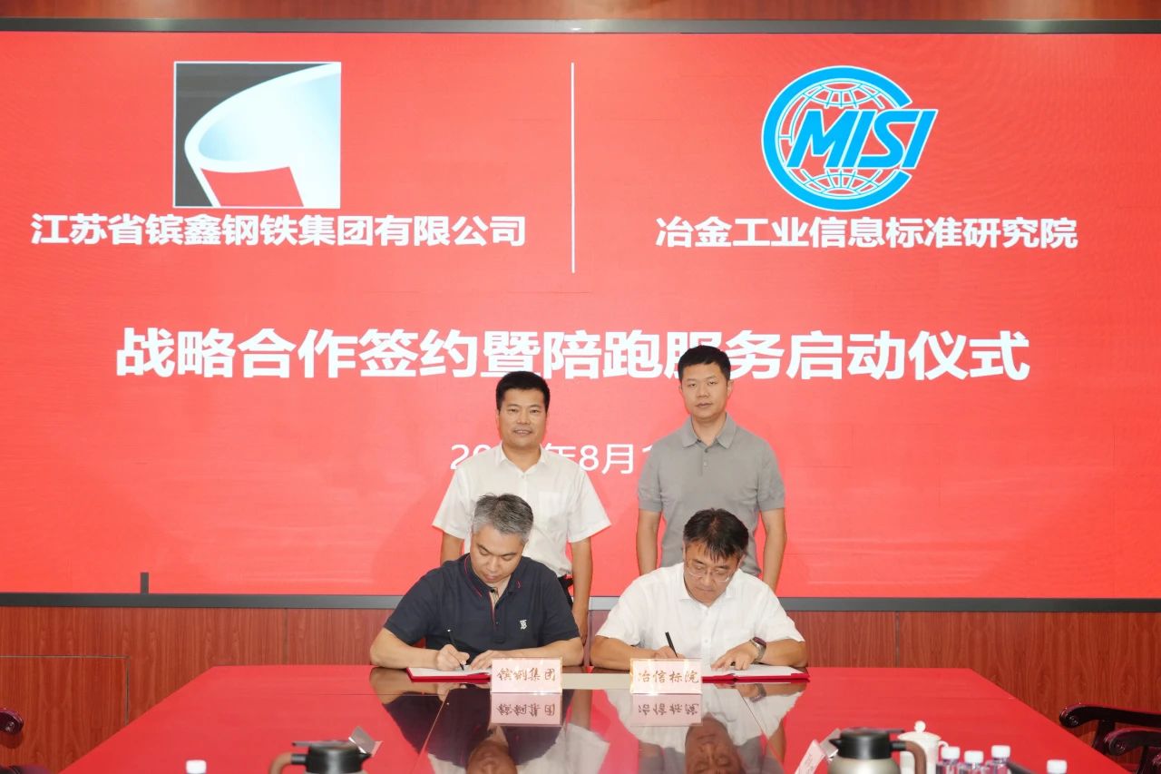 8月11日,江蘇省镔鑫鋼鐵集團有限公司(以下簡稱:镔鋼集團)與冶金工業信息標準研究院(以下簡稱:信息標準院)戰略合作協議簽署暨陪跑服務啟動儀式在北京舉行。此次戰略合作旨在深挖雙方優勢、潛力,充分發揮標準、品牌、信息、谘詢的引領和支撐作用,加快推進镔鋼集團鋼鐵產業高端化、智能化、綠色化,推動镔鋼集團更高質量發展。