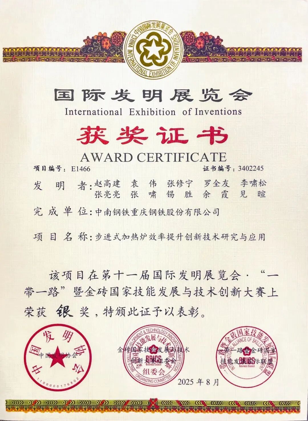 重慶鋼鐵軋鋼廠項目榮獲第十一屆國際發明展銀獎