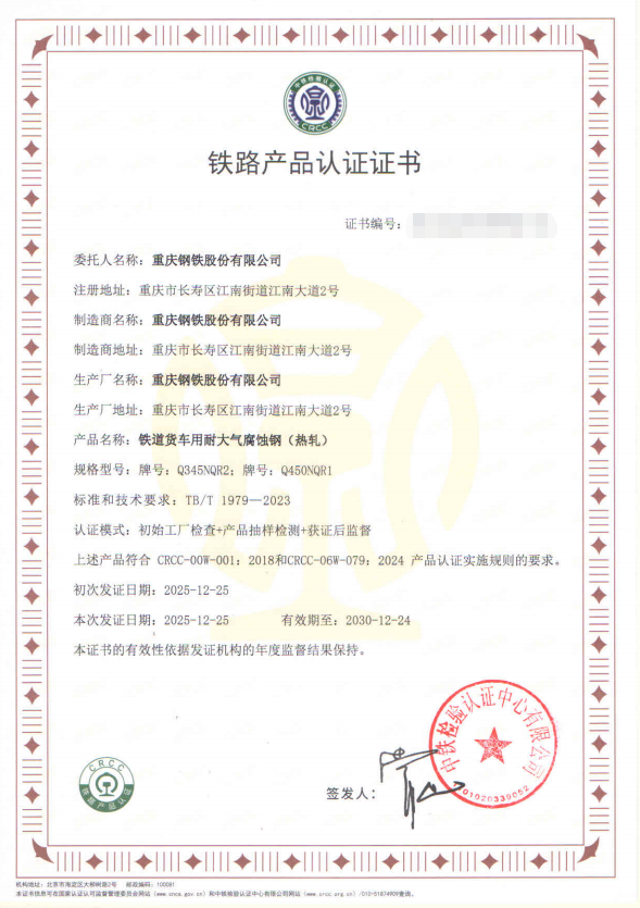 近日,重慶鋼鐵鐵標耐候鋼產品順利通過中鐵檢驗認證中心(CRCC)權威認證,標誌著該公司在該產品質量管理體係與實物質量上全麵契合鐵路行業嚴苛標準,正式斬獲CRCC認證標誌使用權。