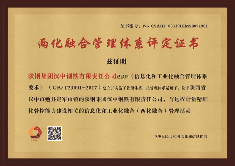 近日,陝鋼集團漢鋼公司順利通過國家工業和信息化部《信息化和工業化融合管理體係要求》(GB/T23001-2017)體係認證,獲得“兩化融合管理體係評定證書”,標誌著公司在推進“信息化和工業化”深度融合方麵進入了一個新的階段。