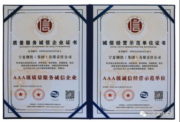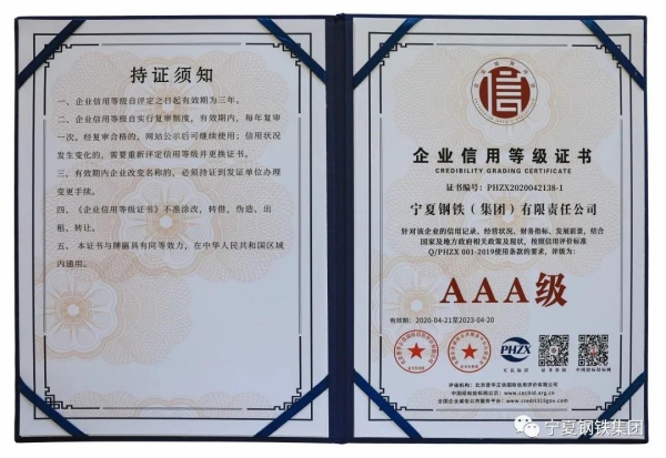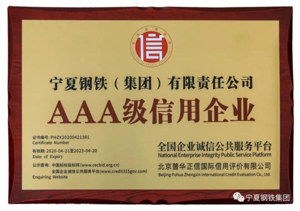 AAA級!寧鋼公司榮獲企業信用評級最高等級